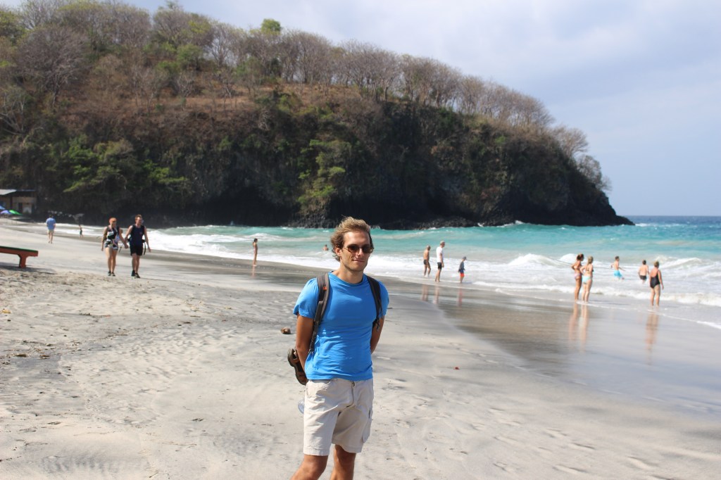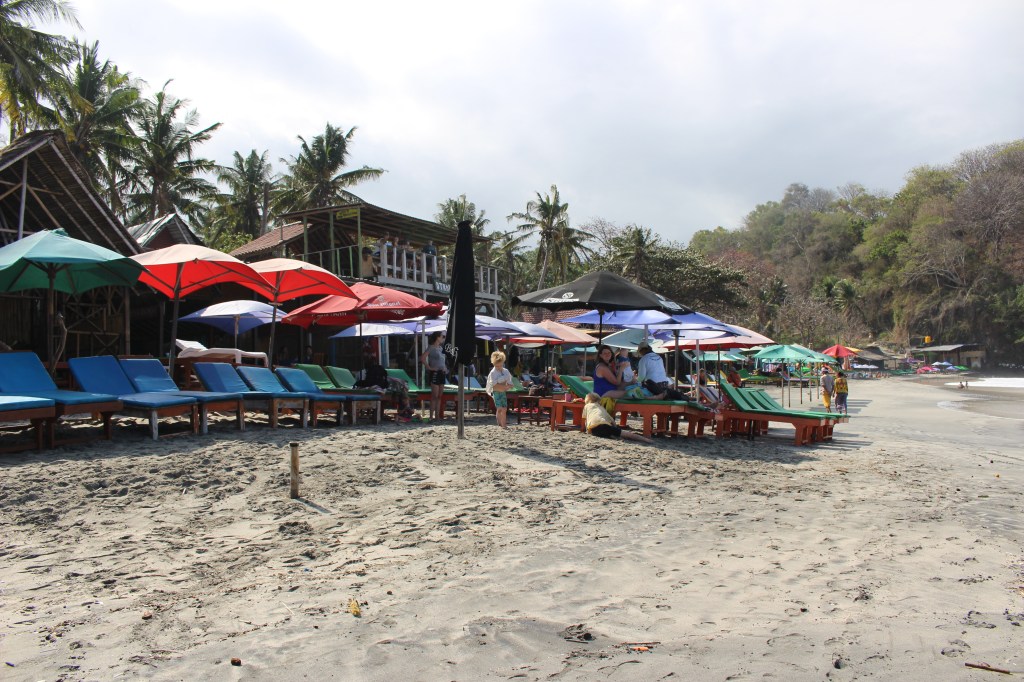 Accès plage : 10 000 idr/pers. C’est une jolie plage, assez fréquentée il faut dire. Il y a de nombreux warungs pour déjeuner qui mettent à ta disposition des transats pour lézarder aussi longtemps que tu le souhaites. Nous sommes assez rapidement repartis avec Flav car la mer était assez agitée ce jour-là.